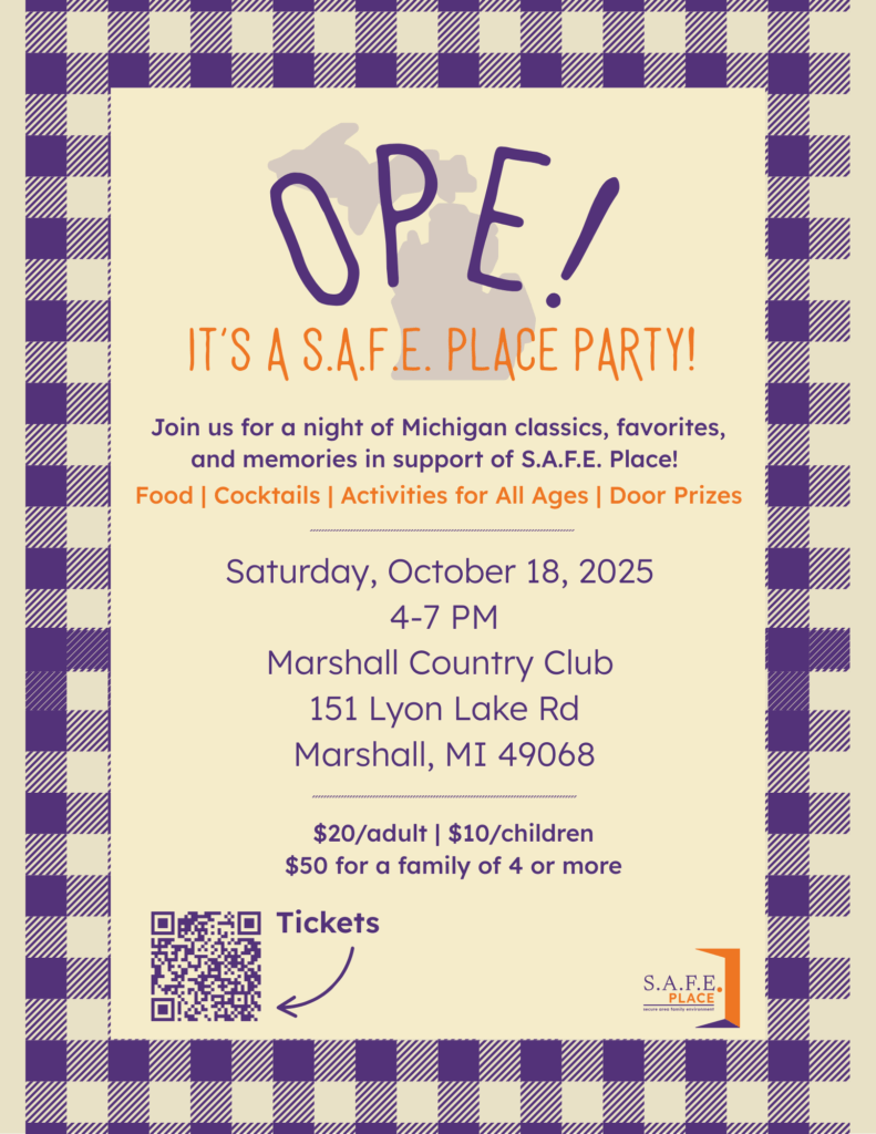 Join us for a night of Michigan classics, favorites, and memories in support of S.A.F.E. Place on Saturday, October 18 from 4-7pm at the Marshall Country Club (MCC).